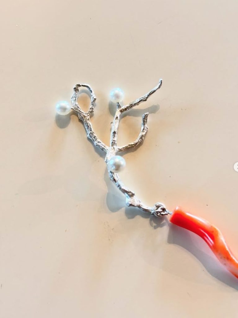↓は珊瑚礁で型取りしたパーツにアコヤ真珠。